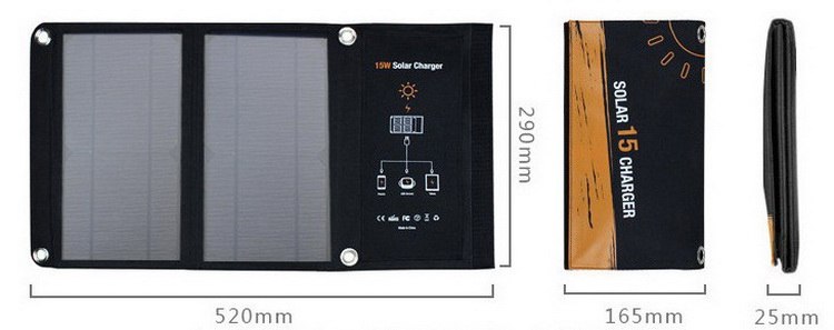 Using the power of two High efficiency solar panels, the 15W Solar Charger is your new best friend when you're far from home. Travel with ease using the charger's bungee loops which attach to your backpack. Unfold the device and expose the 15 watt Monocrystalline solar panel, each section putting out approximately 1200~1300mA under strong sunlight. Dual USB charging ports allow up to two devices to recharge at once at a maximum output current of 2.5 Amps total. No matter where you go, the Solar Charger will be ready for you.