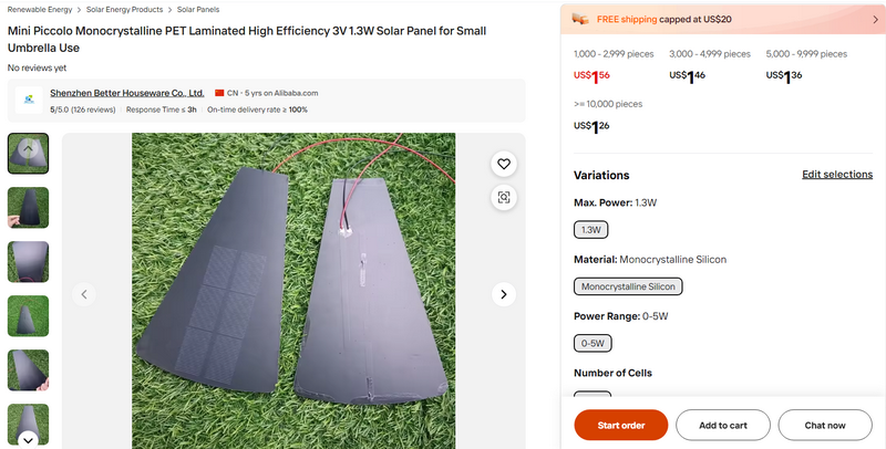 Mini Piccolo Monocrystalline PET Laminated High Efficiency 3V 1.3W Solar Panel for Small Umbrella Use